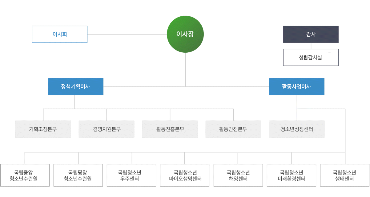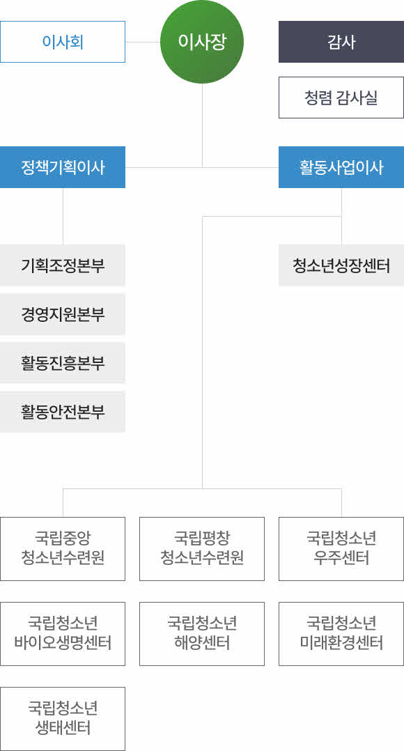 오른쪽은 '활동사업이사'로, 하위 조직에 '활동안전본부', '청소년성장센터'가 있으며, 연결된 소속 기관은 '국립청소년해양센터', '국립청소년미래환경센터',