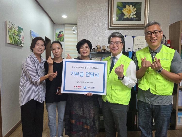 ±¹¸³Ã»¼Ò³â¿ìÁÖ¼¾ÅÍ ÀÌÇö¹è ¿øÀå(¿À¸¥ÂÊ µÎ ¹øÂ°)°ú ¾Æµ¿º¹Áö½Ã¼³ ¡®¹®È¸¶À» °øµ¿»ýȰ°¡Á¤¡¯ÀåÁ¤Èñ ¿øÀå(°¡¿îµ¥) <»çÁø=±¹¸³Ã»¼Ò³â¿ìÁÖ¼¾ÅÍ Á¦°ø> Çѱ¹Ã»¼Ò³âȰµ¿ÁøÈï¿ø(ÀÌ»çÀå ¼Õ¿¬±â)ÀÌ ¿î¿µÇÏ´Â ±¹¸³Ã»¼Ò³â¿ìÁÖ¼¾ÅÍ(¿øÀå ÀÌÇö¹è, ÀÌÇÏ ¡®¿ìÁÖ¼¾ÅÍ¡¯)´Â °íÈﱺ °ü³» ¾Æµ¿º¹Áö½Ã¼³ ¡®ÆÄ¶õ¸¶À½ °øµ¿»ýȰ°¡Á¤(¿øÀå ¸¶ÇâÈñ)¡¯°ú ¡®¹®È¸¶À» °øµ¿»ýȰ°¡Á¤(¿øÀå ÀåÁ¤Èñ)¡¯À» ¹æ¹®ÇØ ±âºÎ±ÝÀ» Àü´ÞÇÏ°í ºÀ»çȰµ¿À» ½Ç½ÃÇß´Ù. ºÀ»çȰµ¿Àº ¡®Ãß¼® ´ÞºûÀ» ä¿ì´Â ¿ìÁÖ¼¾ÅÍÀÇ ³ª´®¡¯À̶ó´Â ÁÖÁ¦·Î ÁøÇàµÇ¾úÀ¸¸ç, ½Ã¼³º°·Î 50¸¸ ¿ø¾¿ ÃÑ 100¸¸ ¿øÀÇ ³óÃÌ»ç¶û»óǰ±ÇÀ» ±âºÎÇÏ¿© û¼Ò³âµéÀ» À§ÇÑ ¸íÀý ½ÄÀÚÀç ±¸¸Å¸¦ Áö¿øÇß´Ù. ±âºÎ±ÝÀº Á÷¿øµéÀÌ ÀÚ¹ßÀûÀ¸·Î ¸ð±ÝÇØ ±× Àǹ̸¦ ´õÇß´Ù. ¿ìÁÖ¼¾ÅÍ Á÷¿øµéÀº ÆÄ¶õ¸¶À½¿¡¼ ÁÖÅà ³»¿ÜºÎ û¼Ò¿Í ½Ã¼³ Á¤ºñ µî ºÀ»çȰµ¿À» ÆîÃÆ´Ù. ¿ìÁÖ¼¾ÅÍ Á÷¿øµéÀÇ ³ë·ÂÀ¸·Î û¼Ò³âµéÀÌ ´õ¿í ÄèÀûÇÑ °ø°£¿¡¼ »ýȰÇÒ ¼ö Àִ ȯ°æÀ» Á¶¼ºÇÒ ¼ö ÀÖ¾ú´Ù.